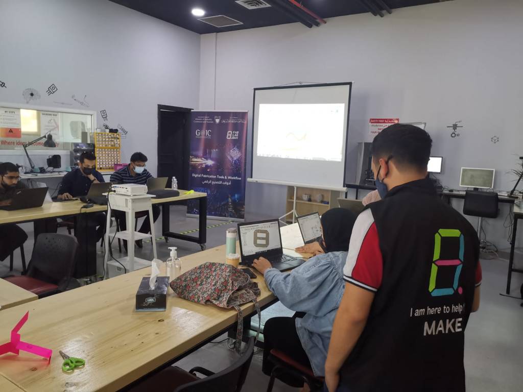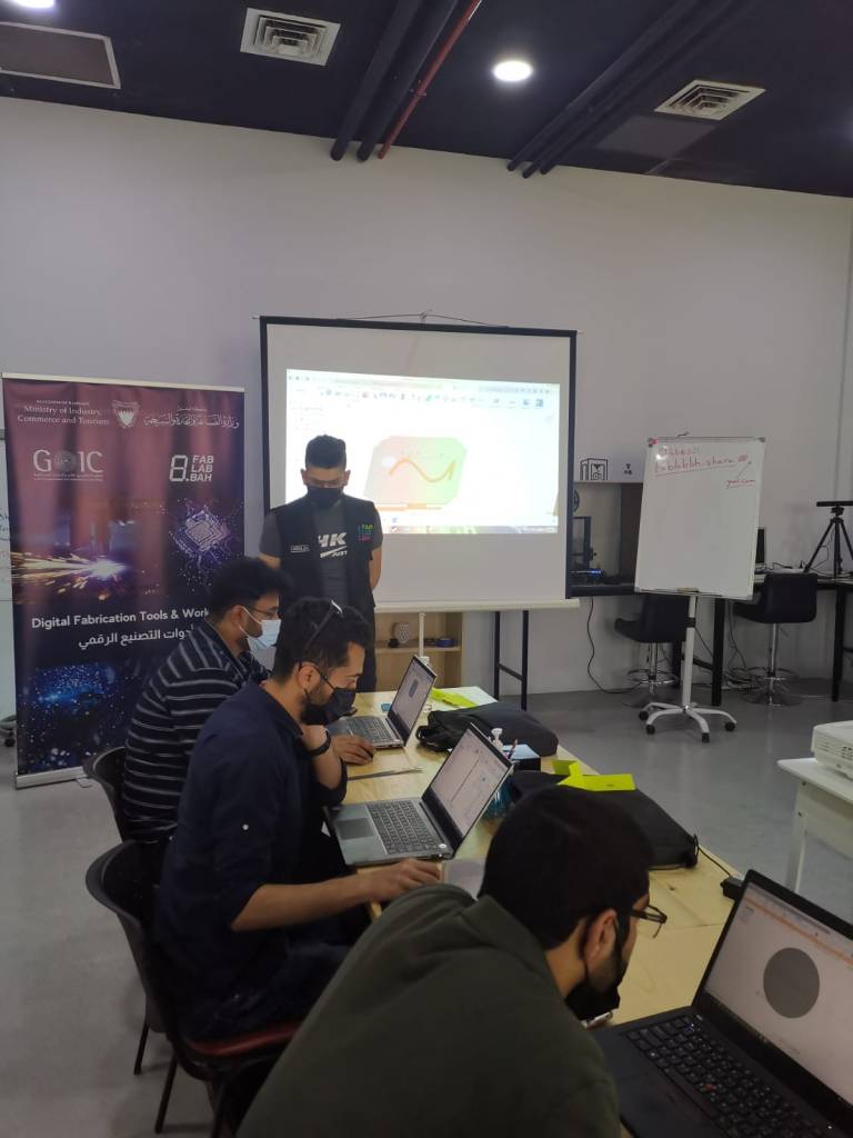 15 trainees from the industrial sector in the Kingdom of Bahrain participate in the training workshop (Digital Fabrication Tools) and lasts for 3 days. This training workshop is also provided by specialists from the Fab Lab Bahrain Institute, where the institute is a laboratory specialized in manufacturing and creativity and encourages innovators to develop their ideas and stimulate their creativity. The institute is equipped with all Tools and materials that enable digital manufacturing in order to encourage young people and professionals to link their physical reality with the future of digital manufacturing.