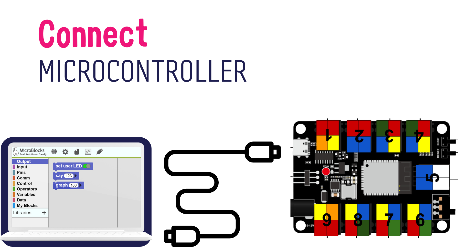 Learners will try to connect the Microcontrollers to their laptops in Microblocks, to get the USB icon turn green.