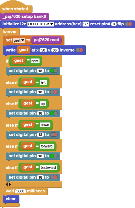 This code reads the value of the Gesture recognition, and based on the value it will turn the 130DC Fan motor on or off.