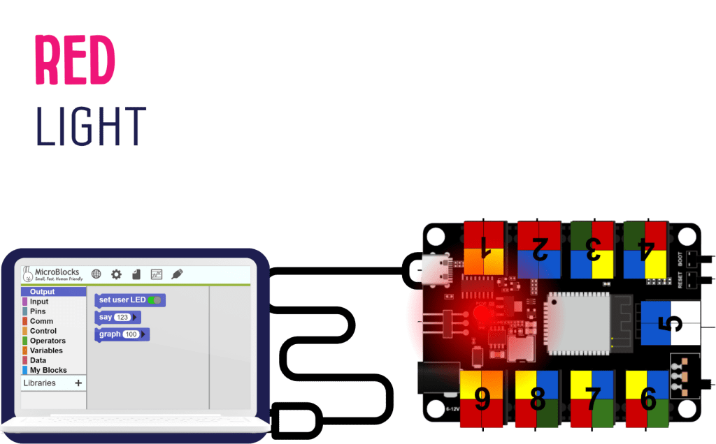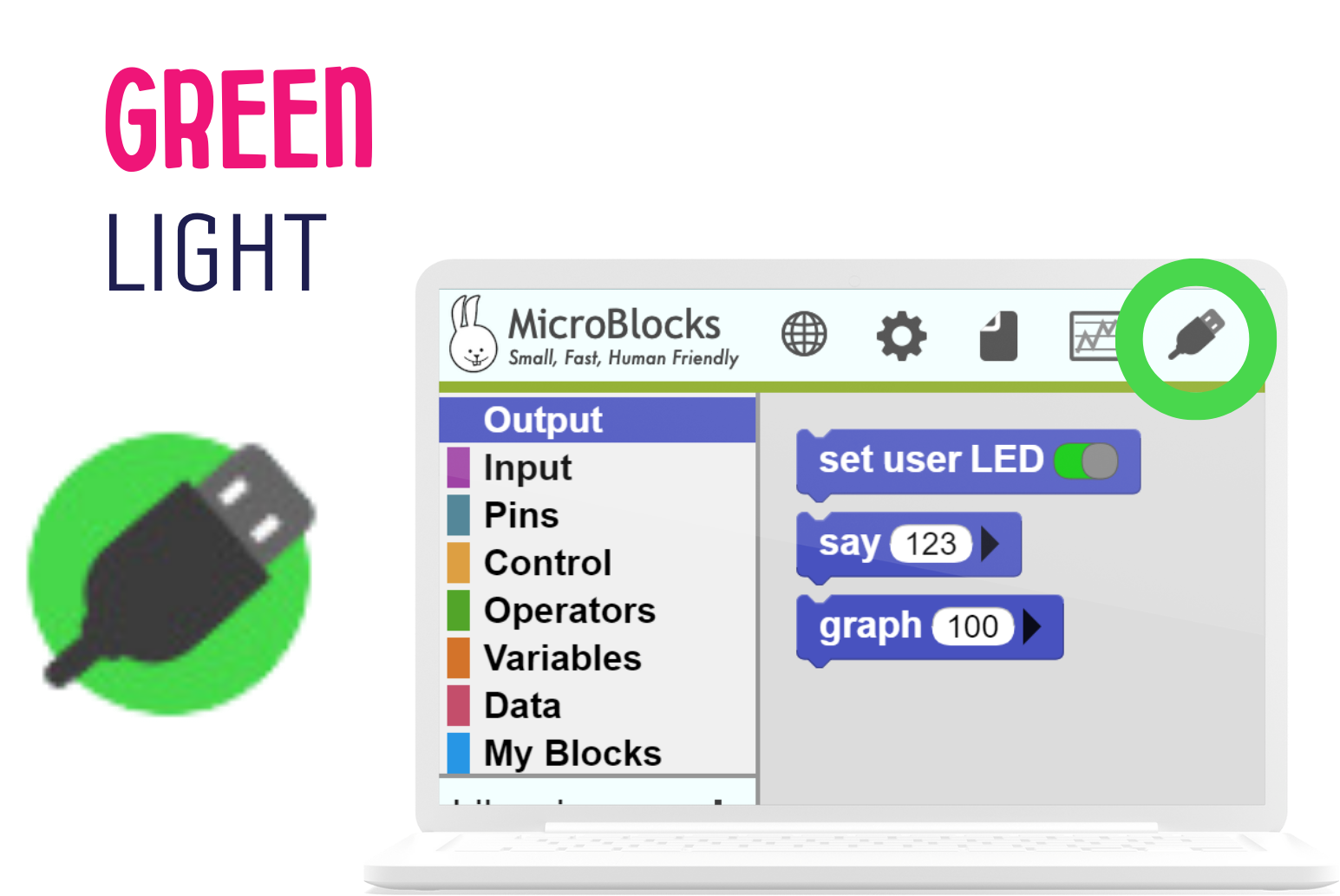 Discover: Let the learners discover how to turn the USB circle in Microblocks to green.