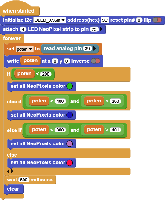 This code reads the value of the Potentiometer, and based on the value it will change the 6812 RGB LED colors.