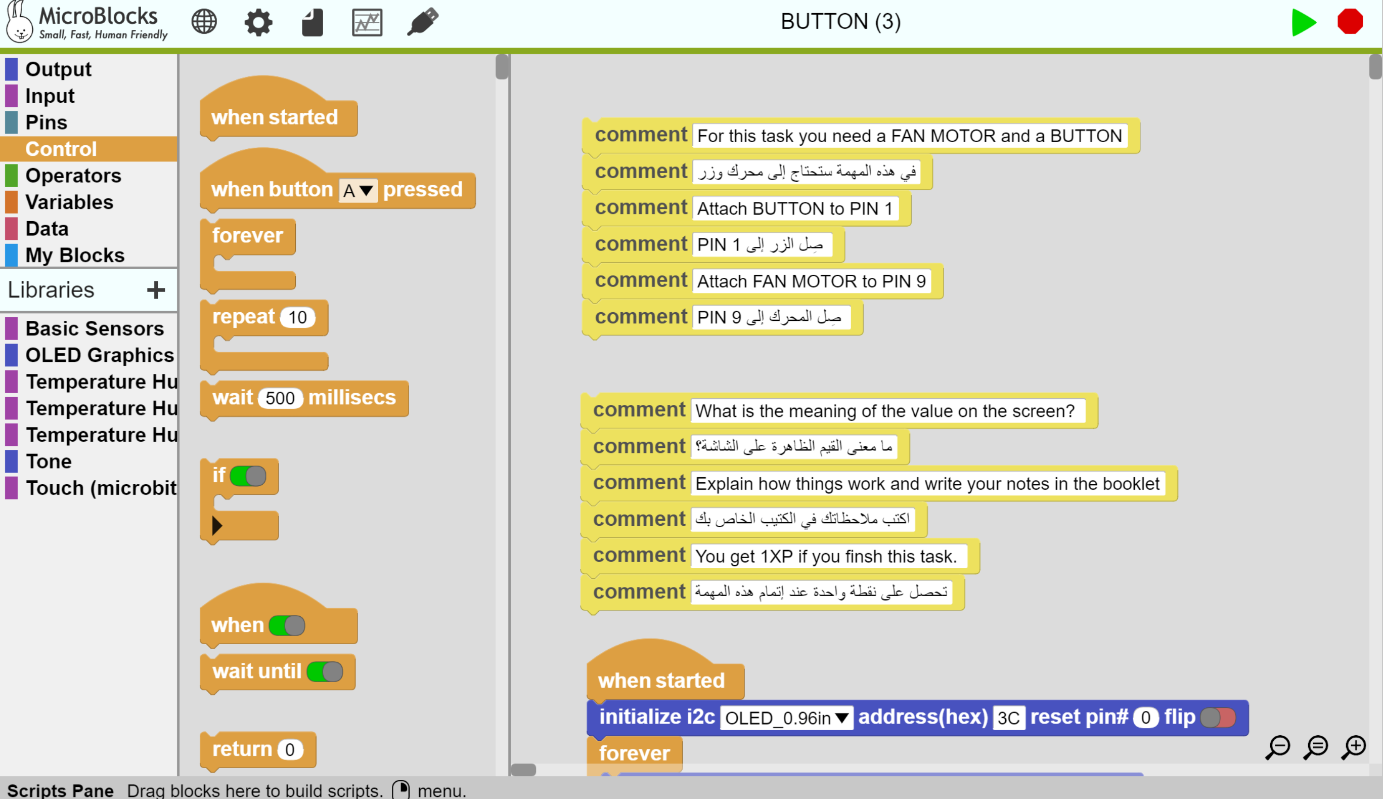 It is good to show the layout of the software, where to find blocks, how to drag and drop blocks, and how to make the code run.