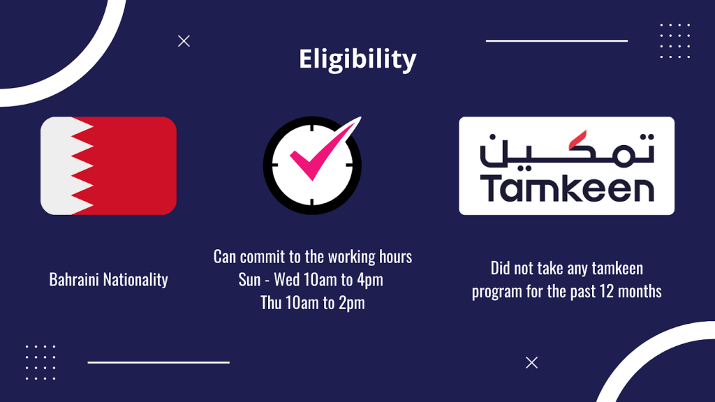 Bahrainis that can commit with the working hours and did not take any Tamkeen program for the past 12 months. Must be proficient in spoken & written English.
